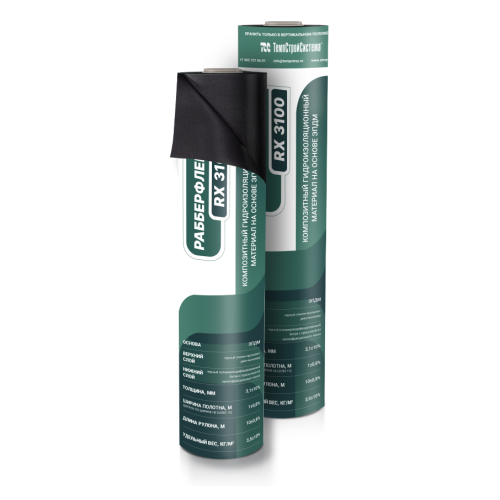 Рабберфлекс RX 3100 представляет собой композитный кровельный и гидроизоляционный материал на основе полимера ЭПДМ (этилен-пропилен-диен-мономер), усиленного армирующей сеткой из стекловолокна, совмещенным с полимермодифицированным (СБС) битумным слоем. Поверхность ЭПДМ имеет специальное покрытие, обеспечивающее рассеивание тепловой и световой энергии и дополнительно защищающее материал. Поверхность полимермодифицированного битумного слоя имеет посыпку из песка мелкой фракции для предотвращения слипания слоев в рулоне.