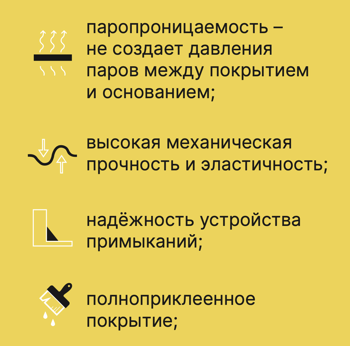 Однокомпонентная мастика, готовая к применению, отверждается под действием влажности воздуха, образует эластичную мембрану;