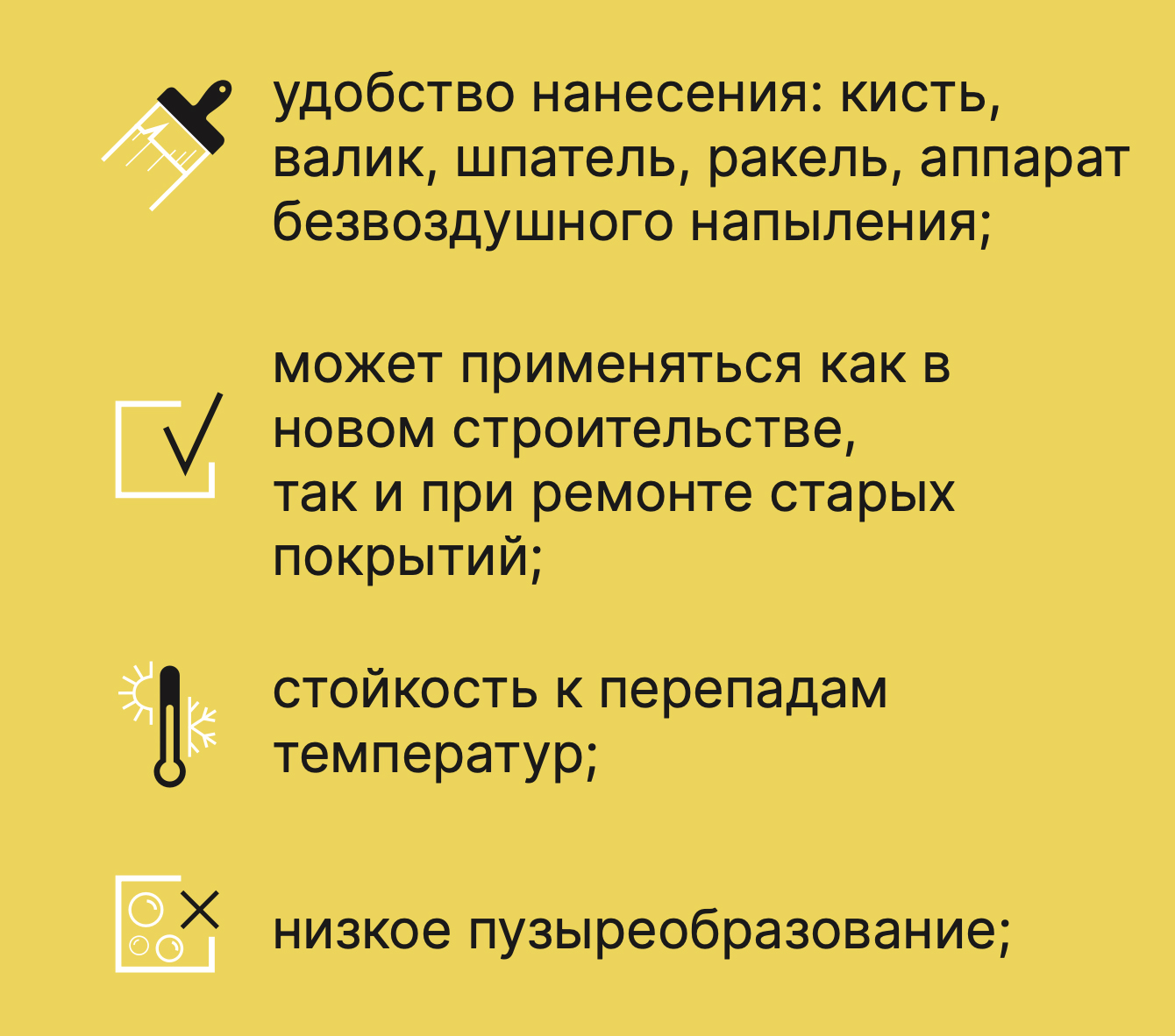 Для получения качественного покрытия не наносить мастику с расходом свыше 0,9 кг на слой. Избыточный расход может приводить к образованию микропузырьков в покрытии.