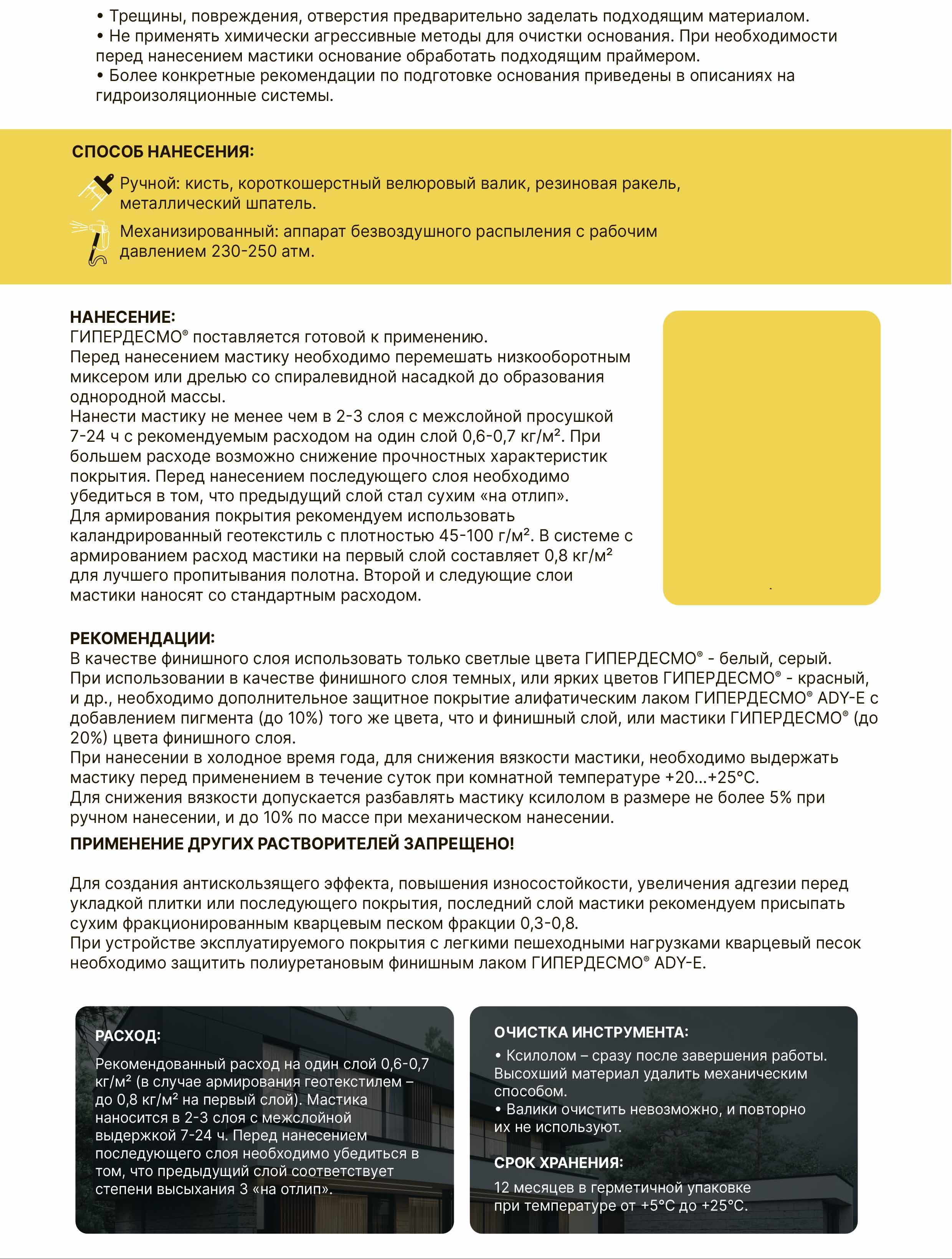 При использовании в качестве финишного слоя темных цветов ГИПЕРДЕСМО® - коричневый, зеленый, красный, необходимо дополнительное защитное покрытие алифатическим лаком ГИПЕРДЕСМО® ADY-E с пигментом (до 10%) того же цвета, что и финишный слой. Также возможно пигментирование мастикой ГИПЕРДЕСМО® (20%).