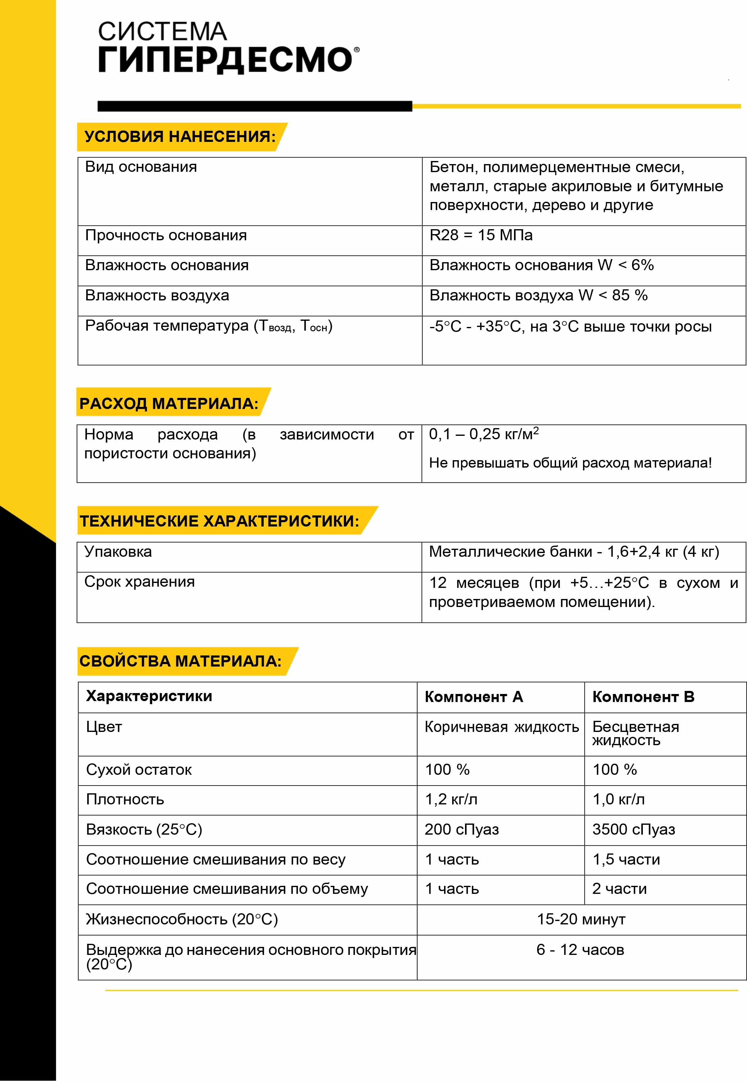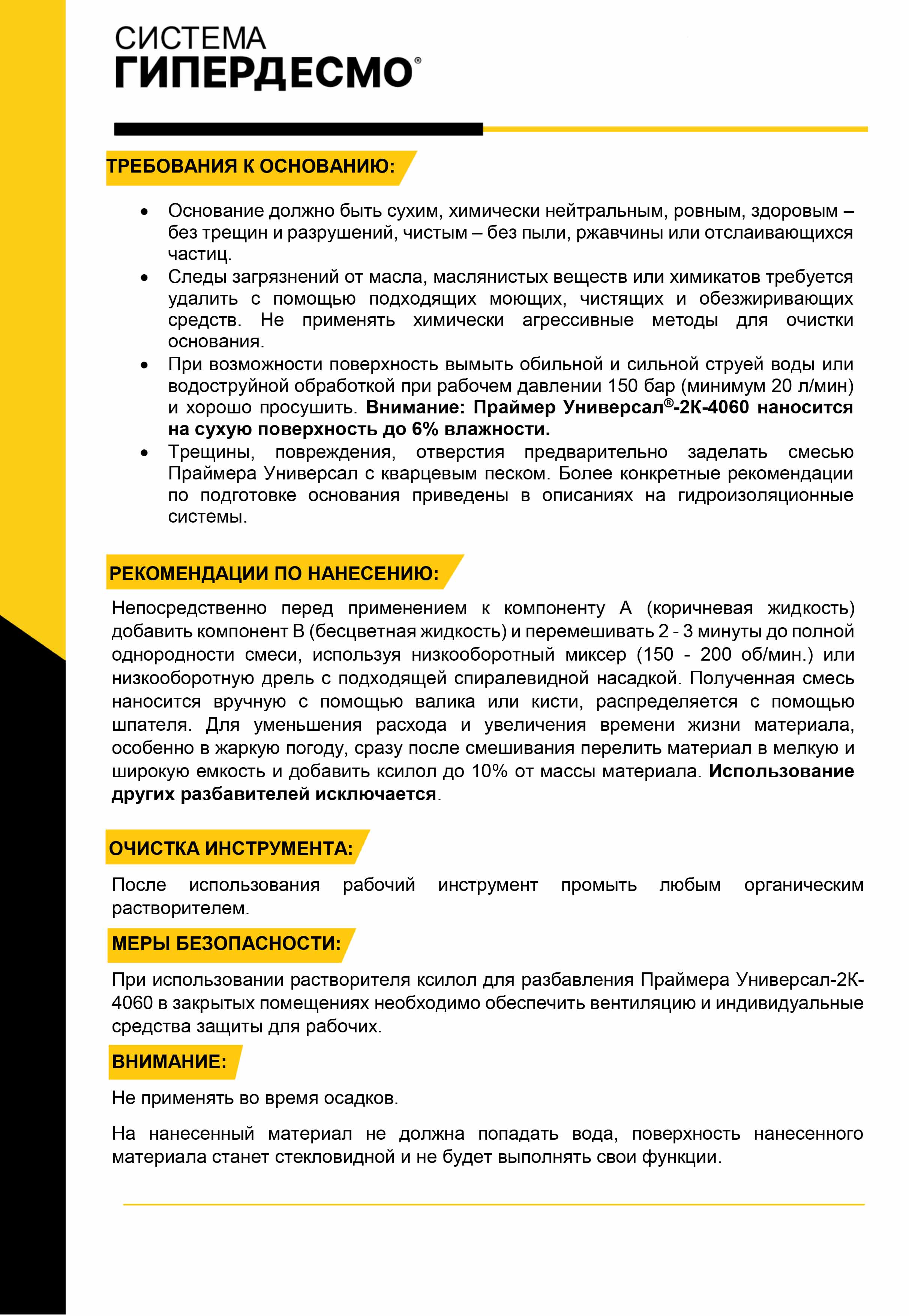 Праймер ГИПЕРДЕСМО УНИВЕРСАЛ (Primer UNIVERSAL) - двухкомпонентная грунтовка на основе полиуретановых смол, повышающая адгезионные свойства (прочность сцепления с основанием) мастик ГИПЕРДЕСМО. Праймер УНИВЕРСАЛ-2К-4060 применяется в качестве: