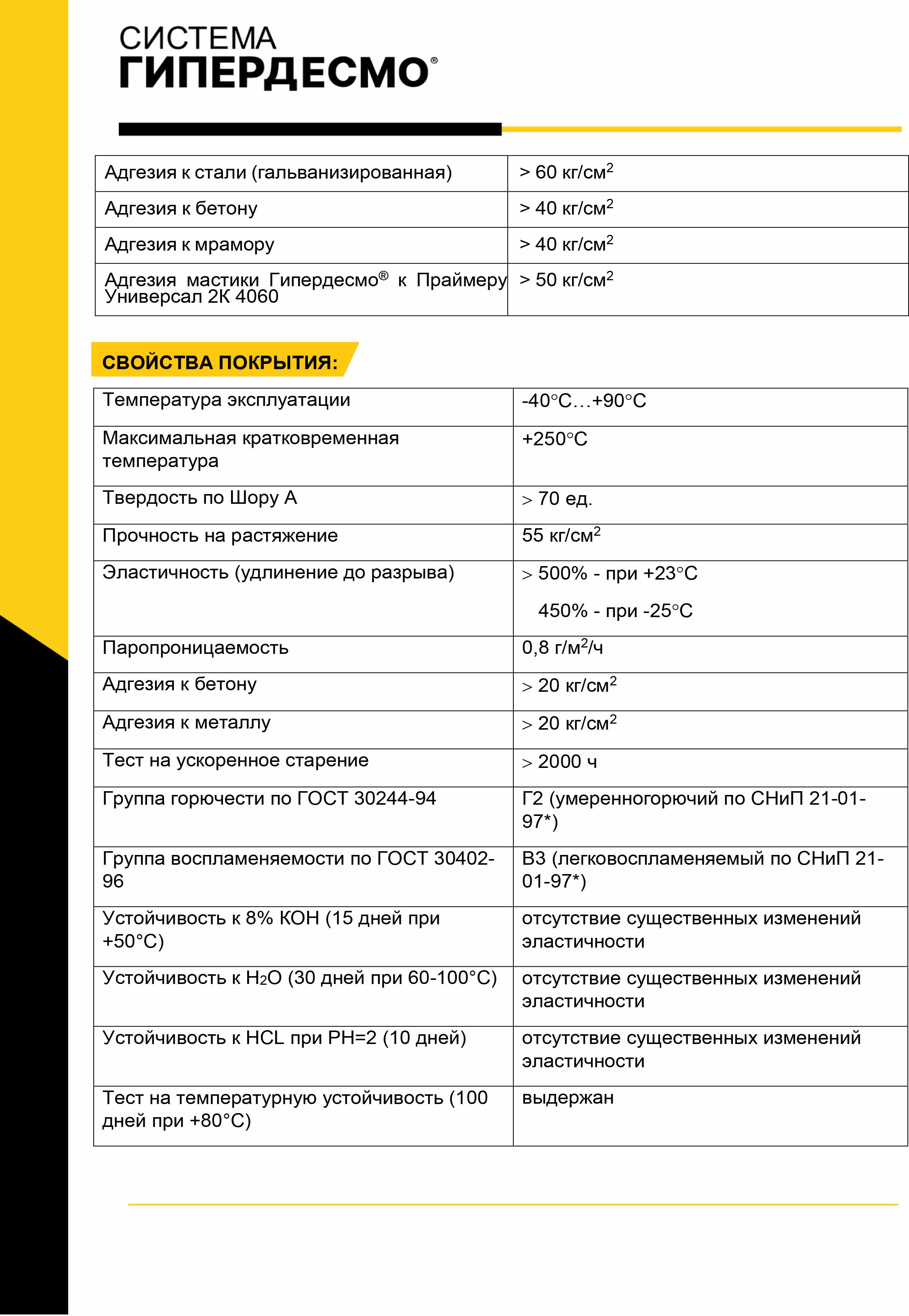 | Адгезия мастики Гипердесмо к праймеру Универсал | > 50 кг/см2 | |