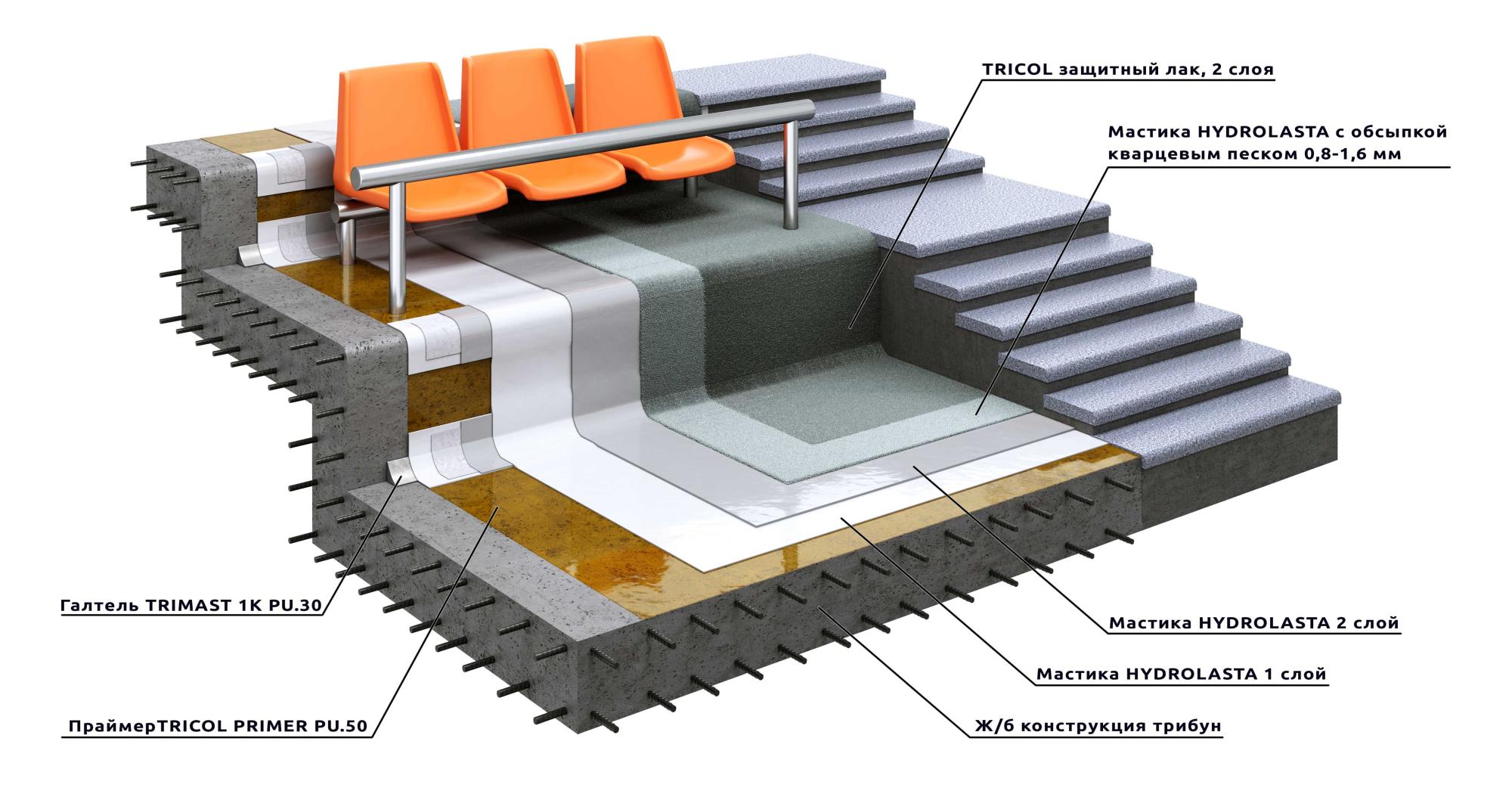 Система Гипердесмо для гидроизоляции трибун стадионов – современная, стойкая к истиранию и ультрафиолетовому излучению система устройства бесшовной гидроизоляции трибун стадионов, открытых паркингов, лестничных маршей и пр.